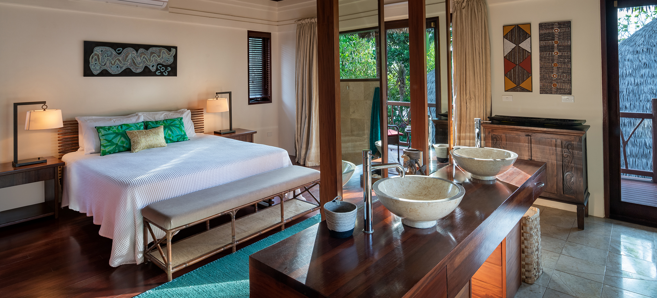 Perched upstairs, the Ocean View Room provides a stunning vista of the South Pacific Ocean through the treetops from your private balcony. This suite includes a king bed with the option to add a single bed, ensuring flexibility for your needs. The master ensuite is equipped with double vanities, a shower, and a bath. Like our other accommodations, it offers a large smart TV, satellite channels, air-conditioning, and a ceiling fan for your comfort.